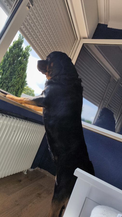 Jack hat seit seiner 8 Lebenswoche in einem großen Haus mit einen eigenen 1000 qm Garten (eingezäunt) gelebt. Er hatte immer Zugang zum Garten und Haus. 2-3mal am Tag sind wir dann spazieren gegangen. (Wald, Stadt, Strand ect.) Er hat auch immer Zugang zum Futter und Wasser.