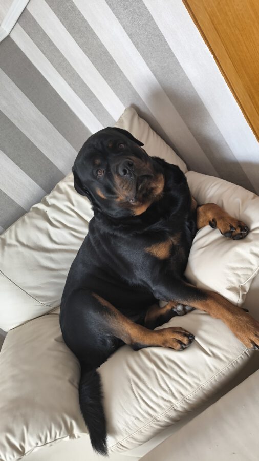 Er schläft gerne auf dem Boden auf kühlen Fliesen. Darf auch mal zum Kuscheln ins Bett oder auf Sofa.